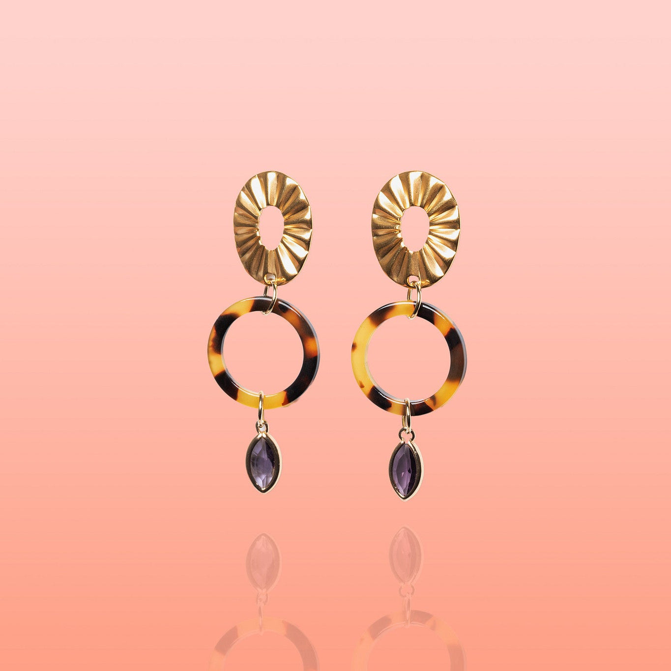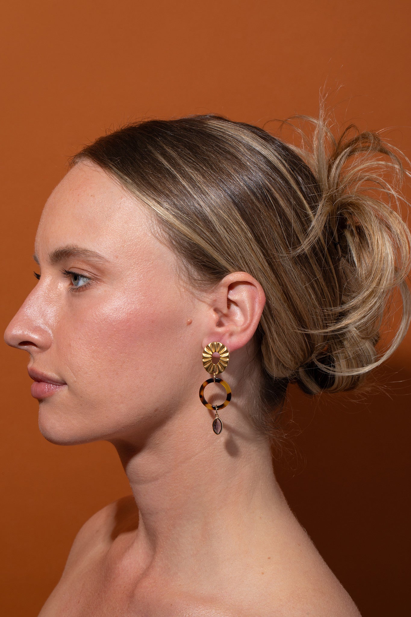 PRODUCT OVERVIEW An elegant exploration of geometric harmony and rich texture. The Noemi Dangles feature a sophisticated vertical design, pairing a radiant gold fluted post with a classic tortoiseshell resin hoop and a final, light-catching faceted glass drop. Engineered for effortless movement, these dangles provide a high-impact silhouette while remaining featherlight for all-day wear.