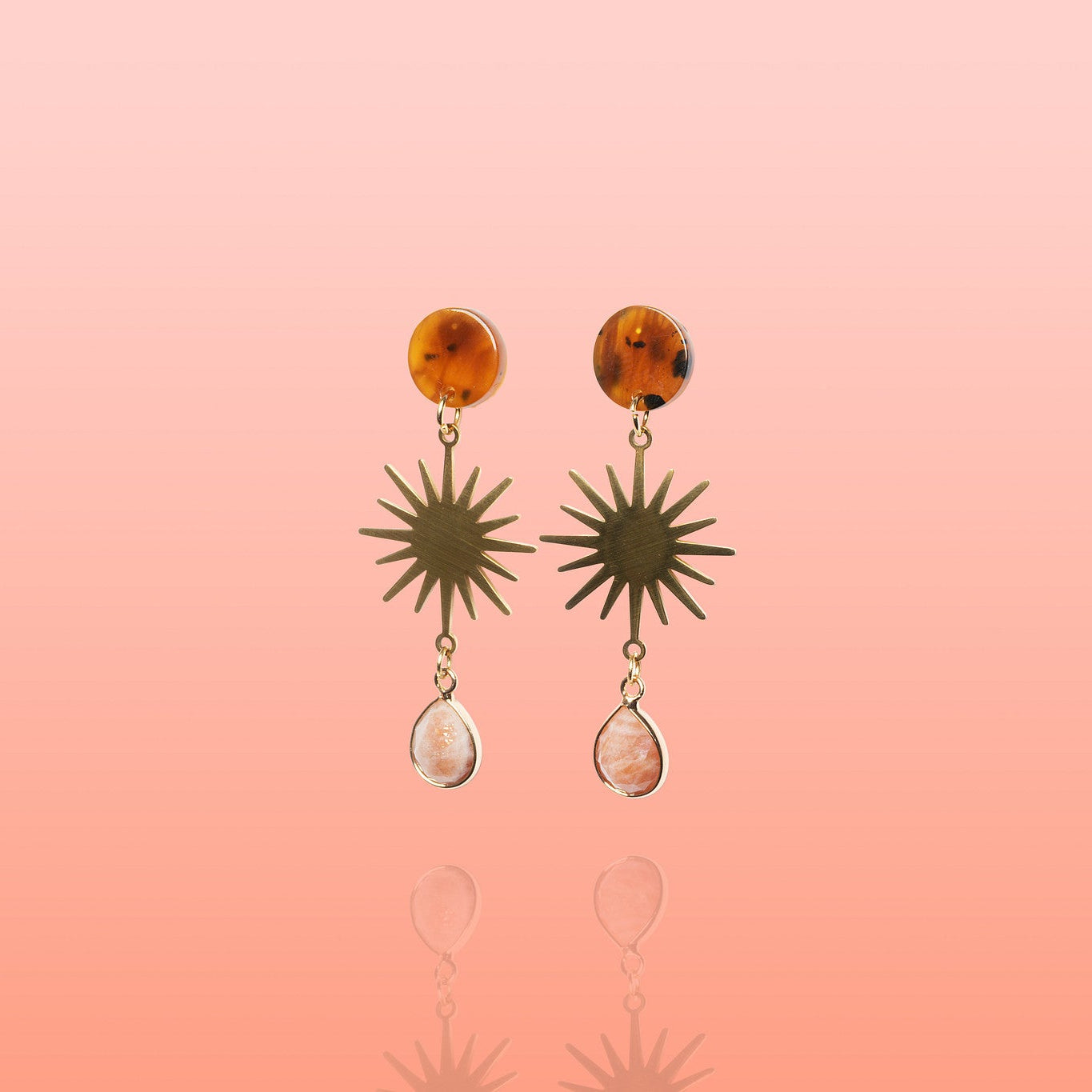 The Solea Dangles feature a sophisticated design, pairing a warm marbled resin post with a striking gold-plated sunburst connector. Finished with a hand-selected, teardrop-shaped sunstone, these earrings offer a luminous silhouette that captures the light with every movement.