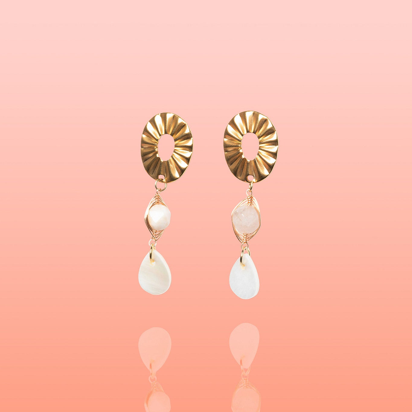 The Paloma Dangles feature a sophisticated design, pairing a radiant gold post with a hand-wrapped light pink jade stone and a final, iridescent shell drop. Designed for the woman who appreciates organic textures and a high-shine finish, these dangles offer a graceful silhouette that remains effortlessly lightweight.
