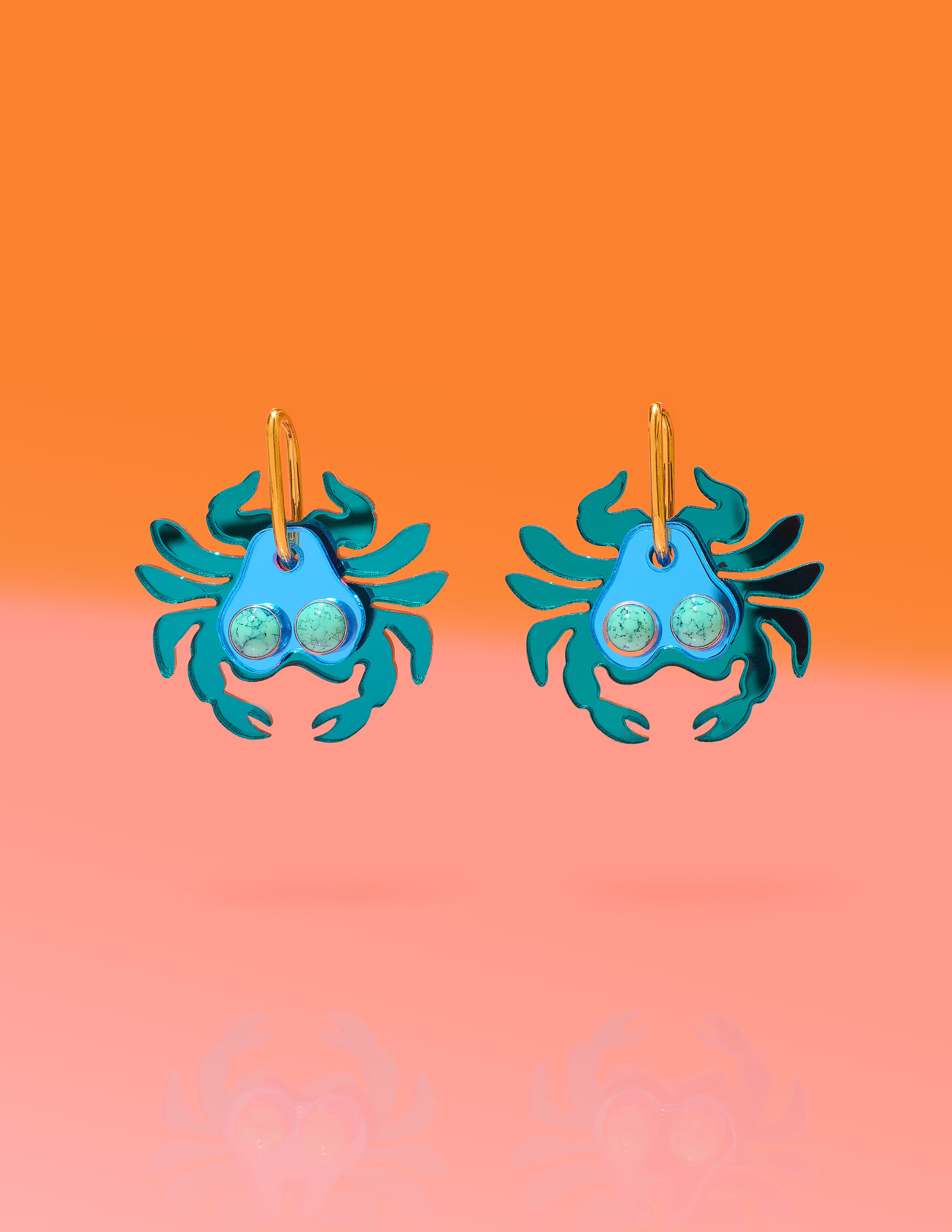 Materials: Mirror acrylic, faux turquoise stone rivets and 14k plated surgical stainless steel huggie hoops.