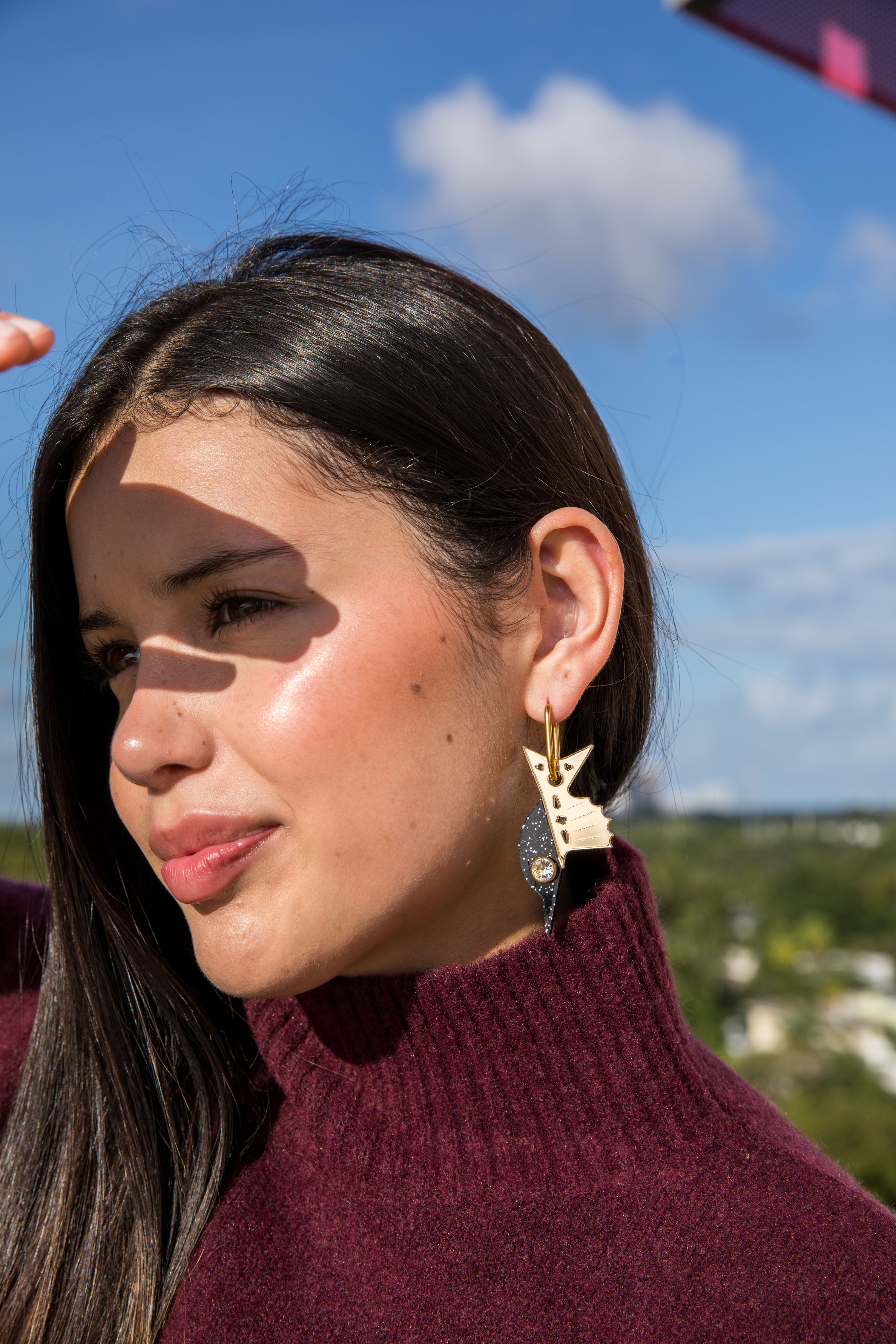 Materials: Acrylic, mirror acrylic, faux clear stones, 14k gold plated surgical stainless steel huggie hoops