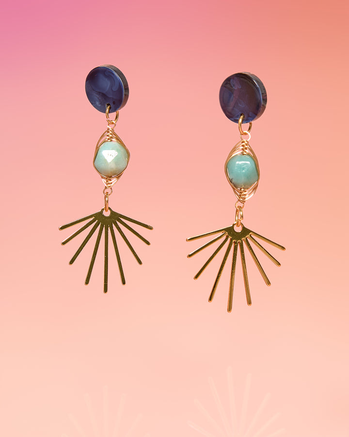 Materials: Resin, gold plated charms, jade stone, and hypoallergenic stud post