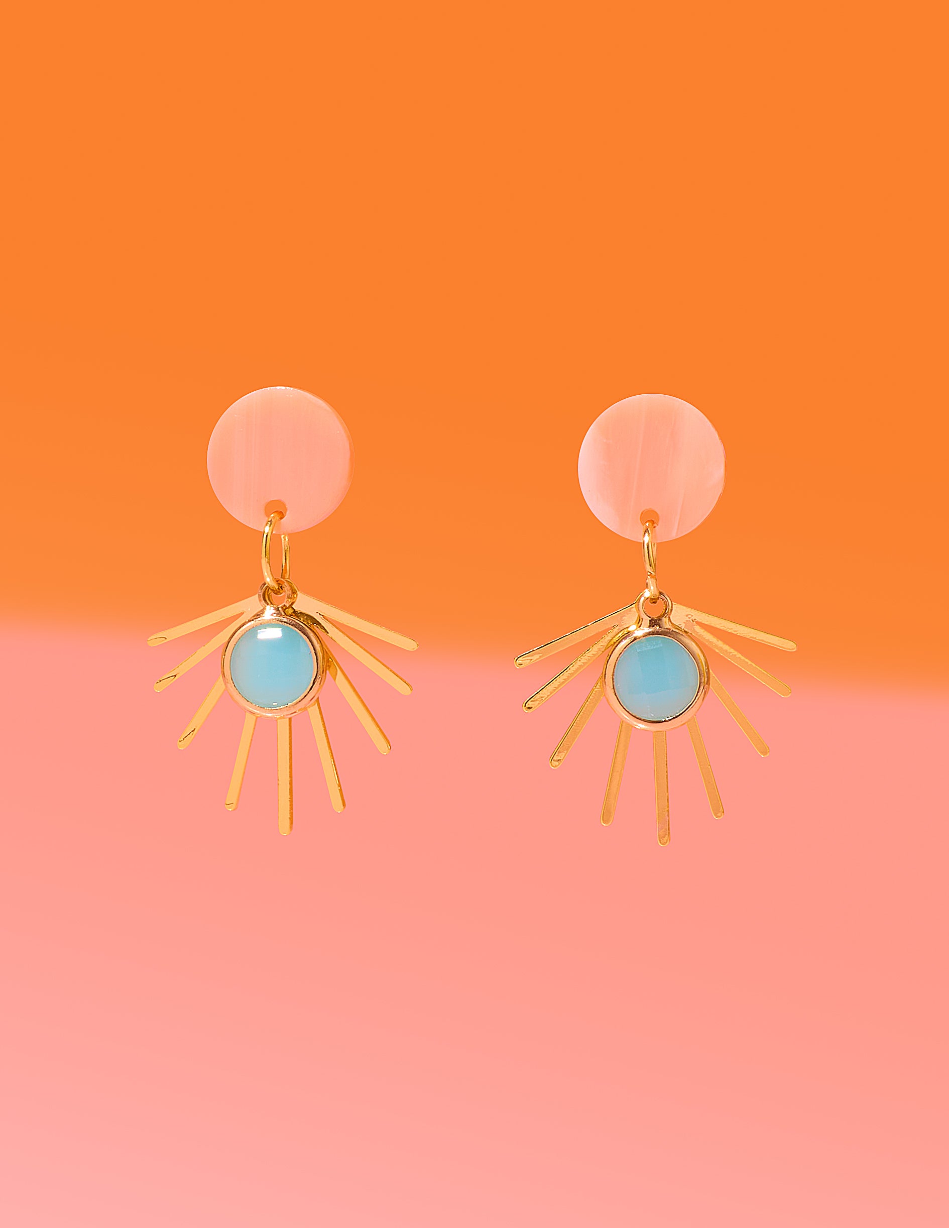 A colorful and joyful finishing touch designed to be the perfect mid-length everyday statement for your year-round collection. The Summer Pop Dangle Earrings feature a sophisticated vertical silhouette, pairing a soft peach resin post with a radiant 14k gold-plated surgical stainless steel sunburst. Engineered for "featherlight" comfort, these dangles offer a refined, artisan energy that transitions seamlessly from a sun-drenched morning to an elegant evening ensemble.
