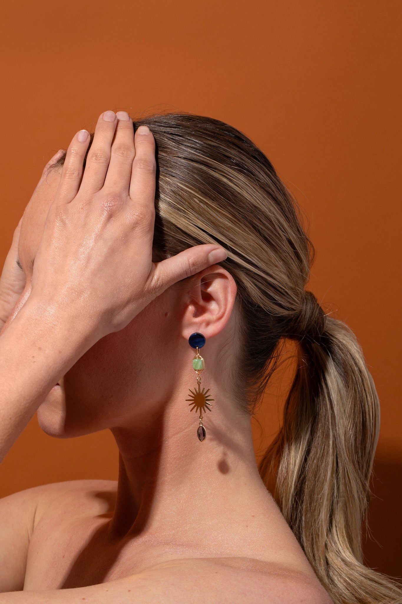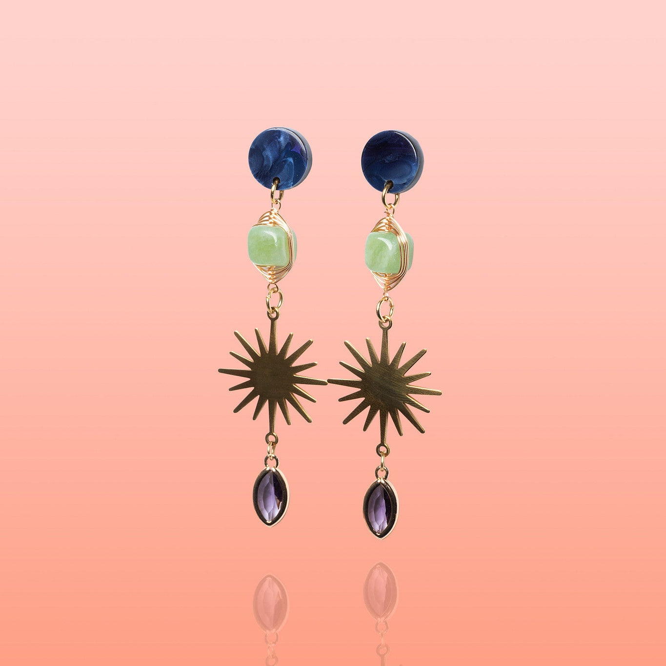 The Alma Dangles feature a high-impact vertical design, pairing a deep navy marbled post with hand-wrapped genuine green jade and a striking gold-plated starburst. Finished with a light-catching glass drop, these earrings offer a rich, multi-textured silhouette that commands attention while remaining light enough for all-day wear.