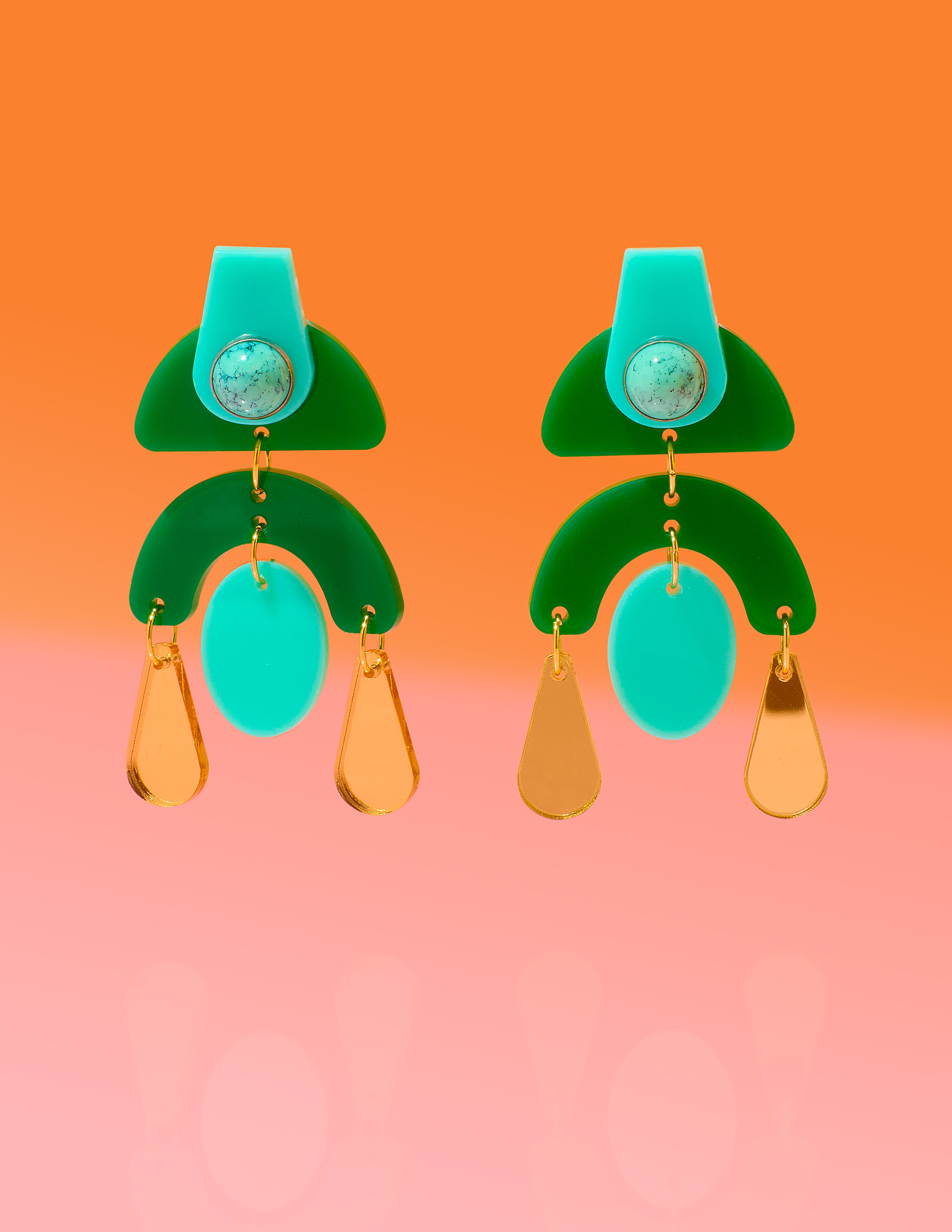 Materials: Mirror acrylic, faux turquoise stone rivets and surgical stainless steel posts.
