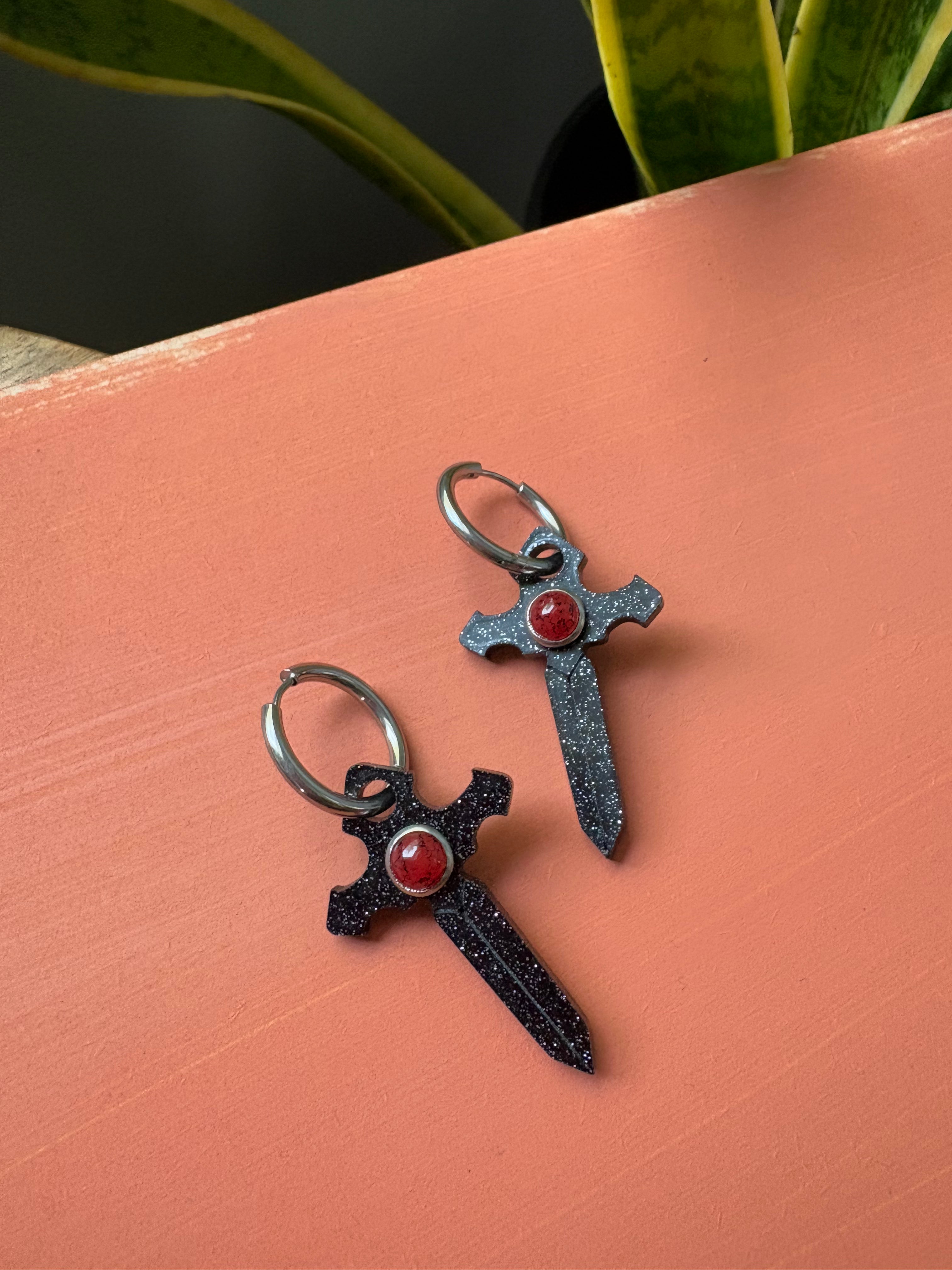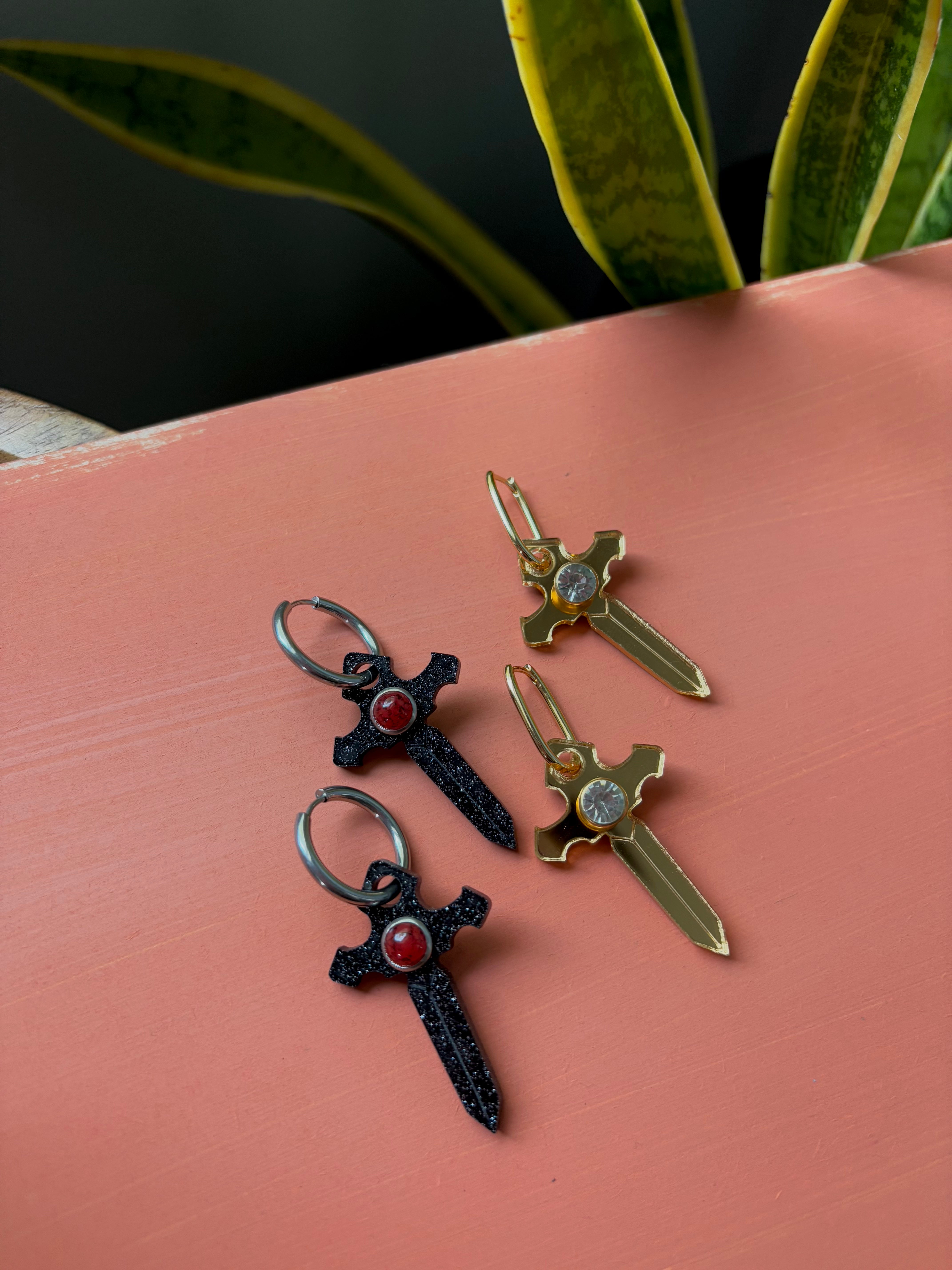 Materials: Acrylic, mirror acrylic, faux red stone rivet, Glass rivet, 14k gold plated surgical stainless steel huggie hoops