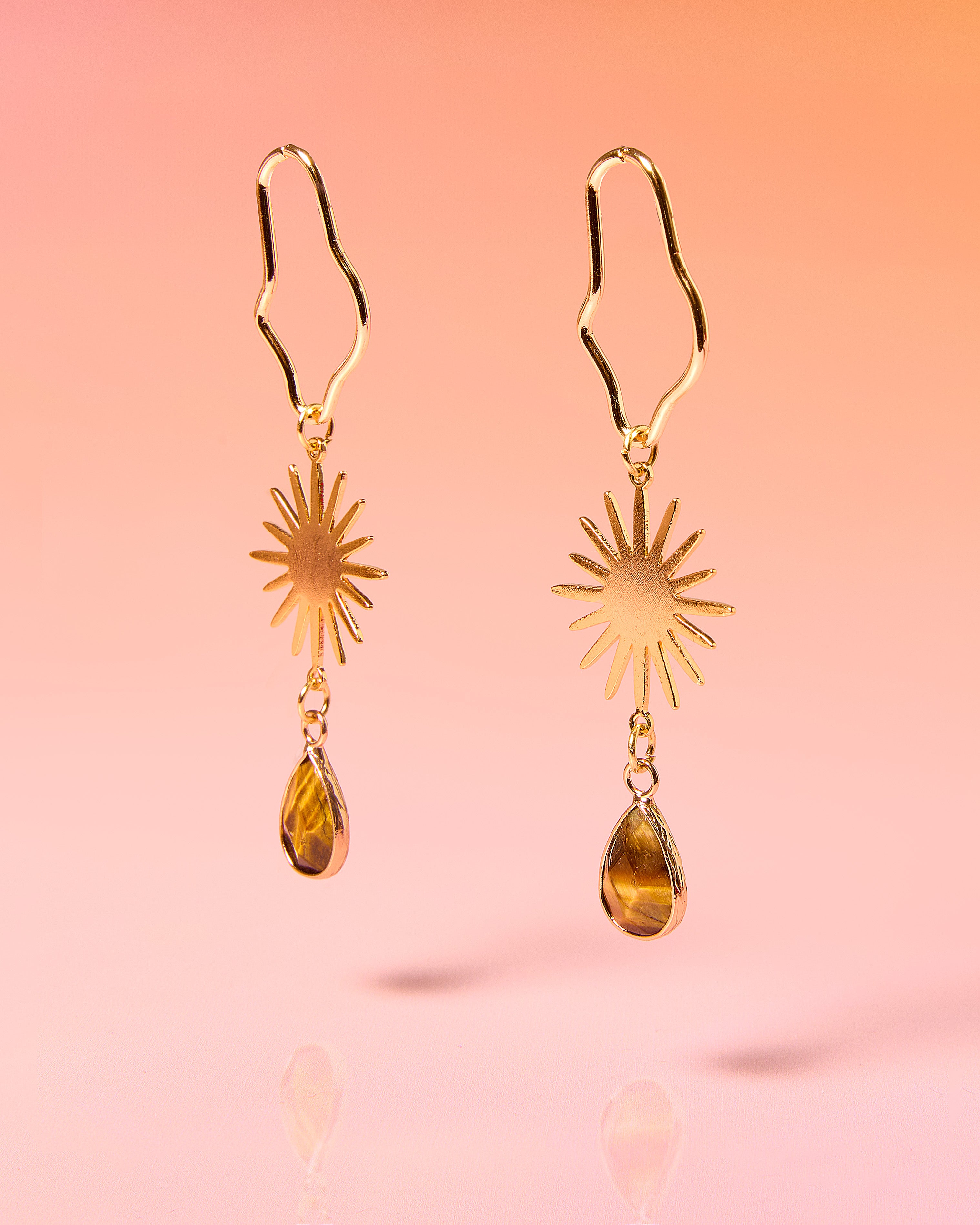 Materials: 18k gold plated post, 18k gold plated Sun, Tiger Eye Natural Stone Charm